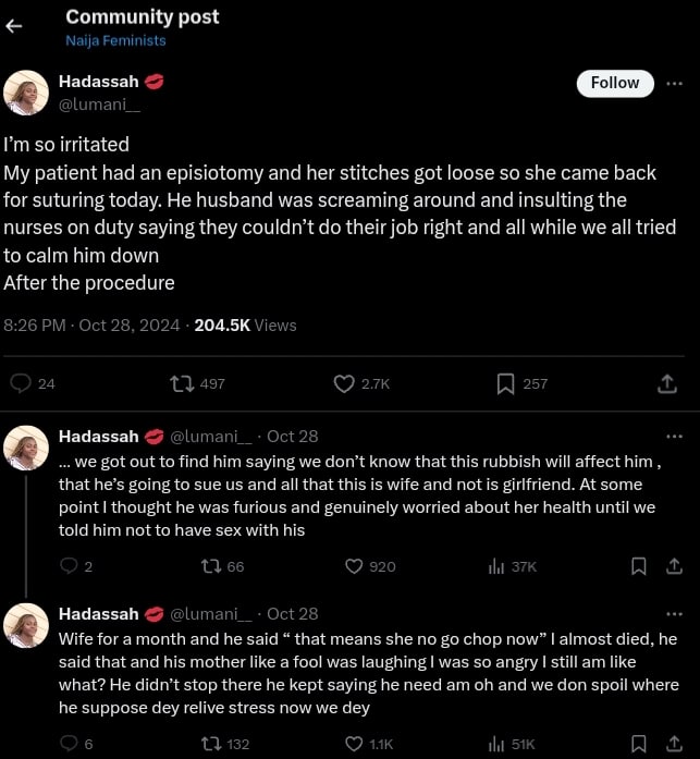 In her post on X (formerly Twitter), the nurse shared an incident involving a patient who had recently undergone an episiotomy.