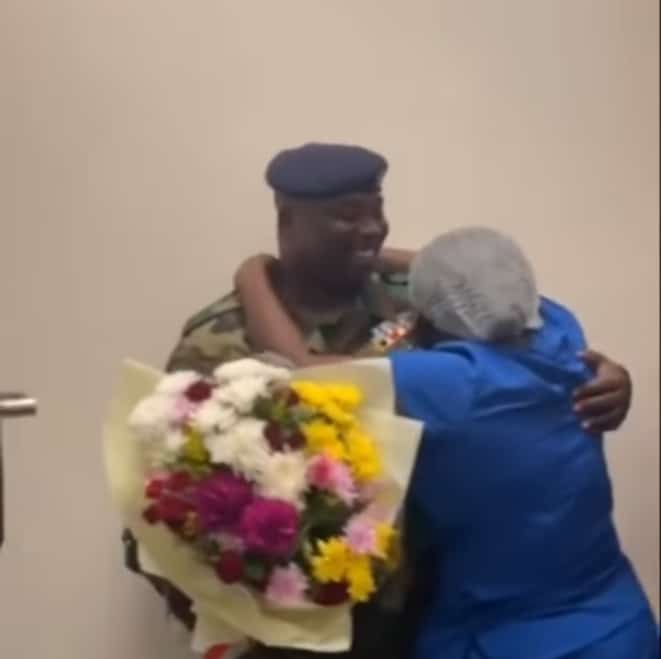Nurse screams in joy as her soldier lover shows up unannounced at her workplace, gifts her flowers (Video)