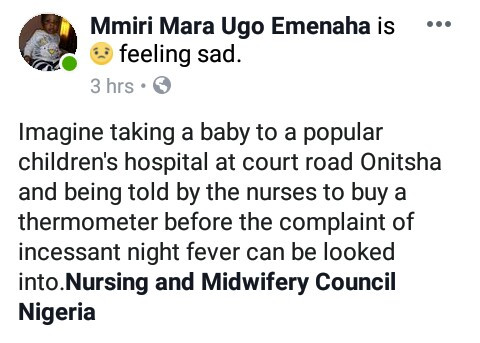 ‘Imagine taking a baby to a popular children’s hospital at court road Onitsha and being told by the nurses to buy a thermometer before the complaint of incessant night fever can be looked into.Nursing and Midwifery Council Nigeria”