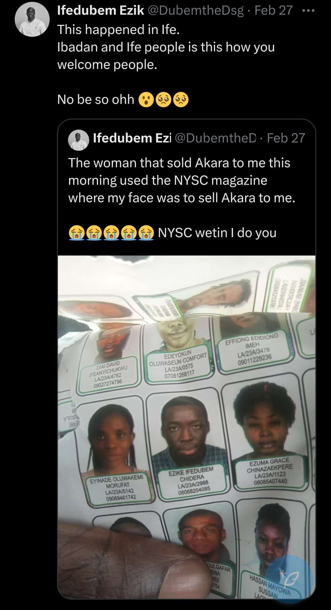 “The woman that sold Akara to me this morning used the NYSC magazine where my face was to sell Akara to me. NYSC, wetin I do you?”