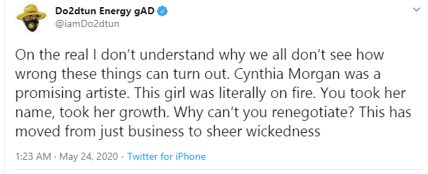“On the real I don’t understand why we all don’t see how wrong these things can turn out. Cynthia Morgan was a promising artiste. This girl was literally on fire. You took her name, took her growth. Why can’t you renegotiate? This has moved from just business to sheer wickedness