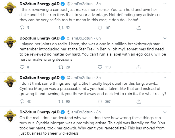 OAP Dotun has reacted to report of Cynthia Morgan loosing all she has achieved after she fall out with her former record label, owned by Jude Okoye.
