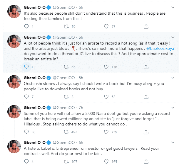 OAP Gbemi stated that people who can’t let go of N5k are asking record labels being owed millions to “just forgive and forget“.