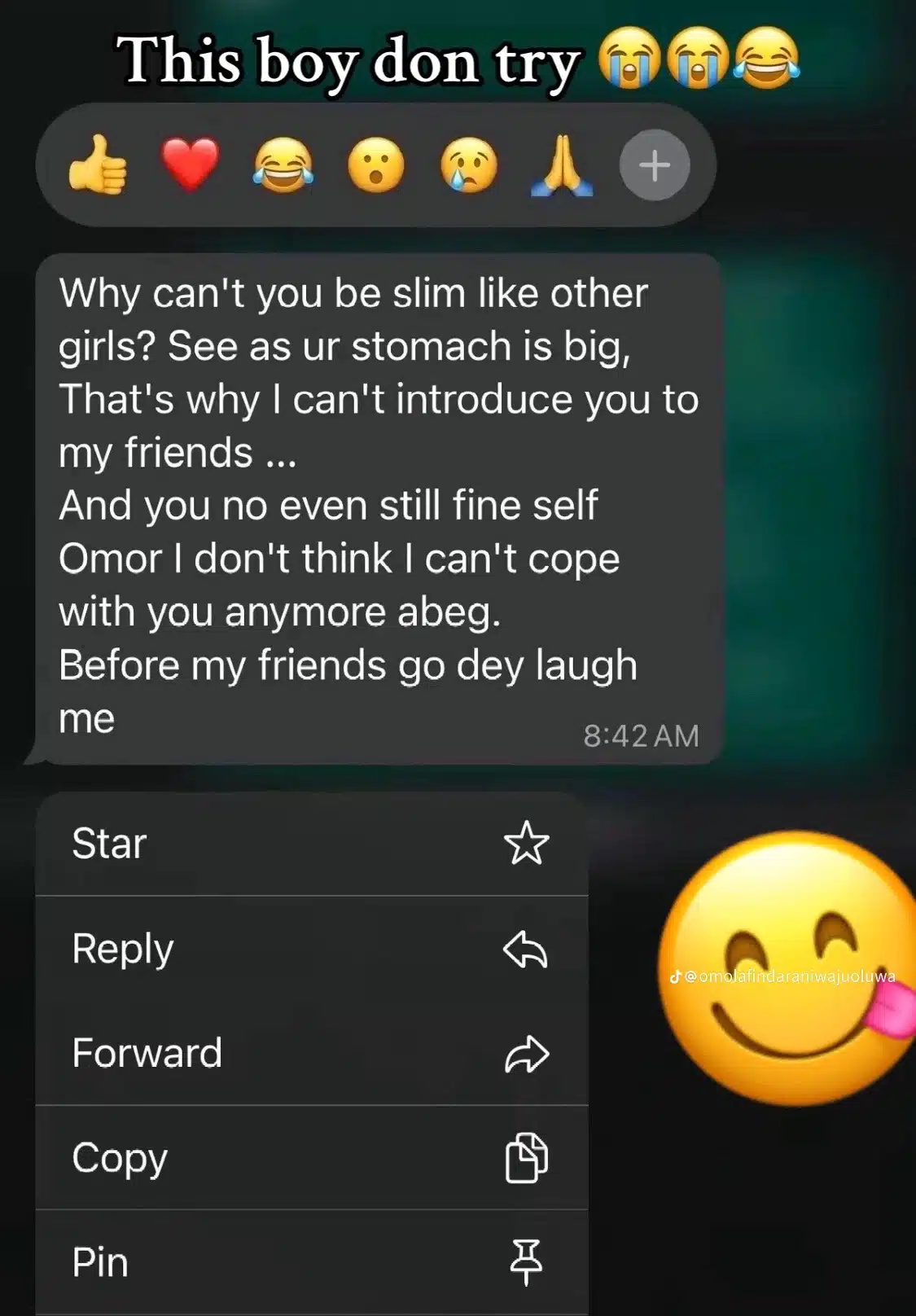 The message read: “Why can’t you be slim like other girls? See how big your stomach is. That’s why I can’t introduce you to my friends. And you’re not even that attractive. Honestly, I don’t think I can continue with you before my friends start laughing at me.”