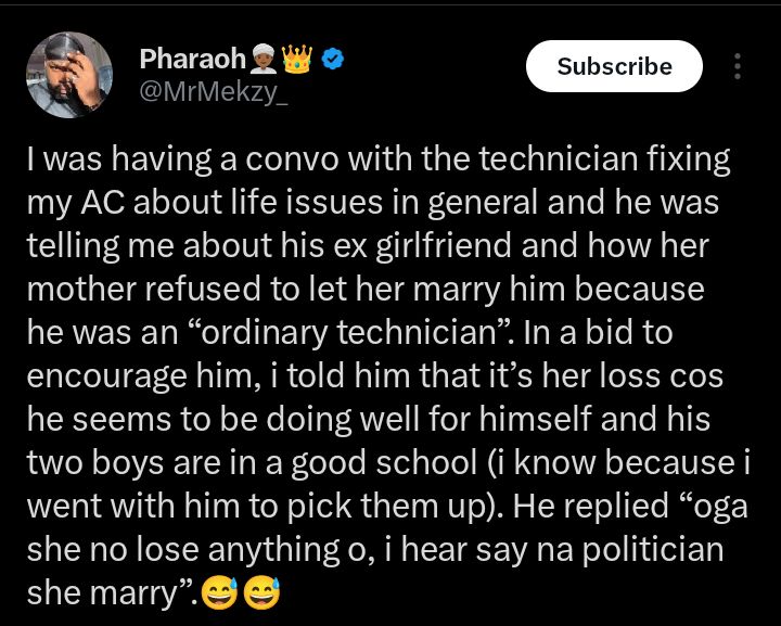 The technician, however, delivered an unexpected twist: “Oga, she no lose anything o, I hear say na politician she marry.”