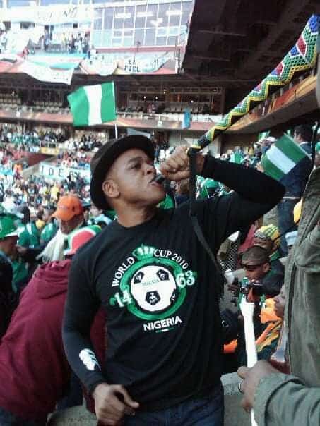 Another showed him at the stadium rejoicing with fellow Nigerian supporters.
