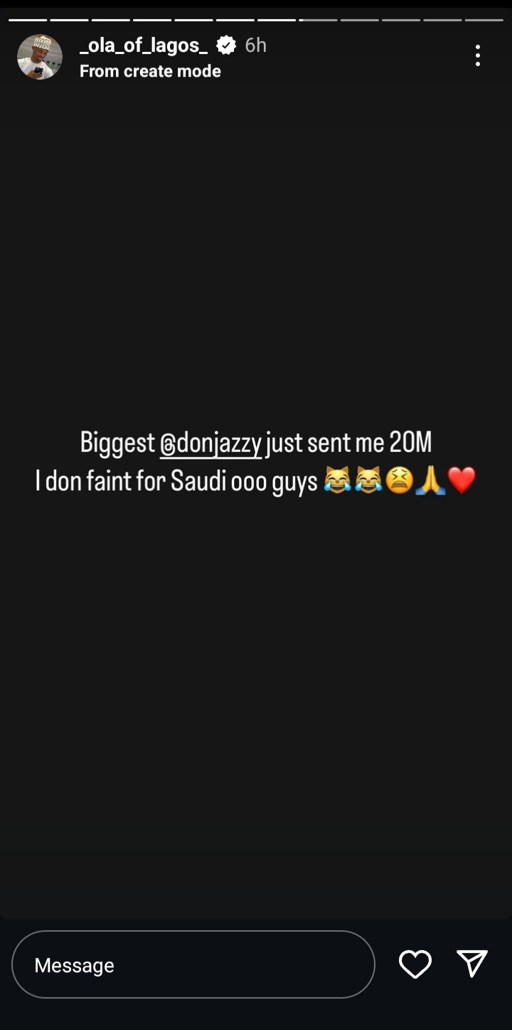 “Biggest @donjazzy sent me 20m I don faint for Saudi ooo guys,” he wrote.