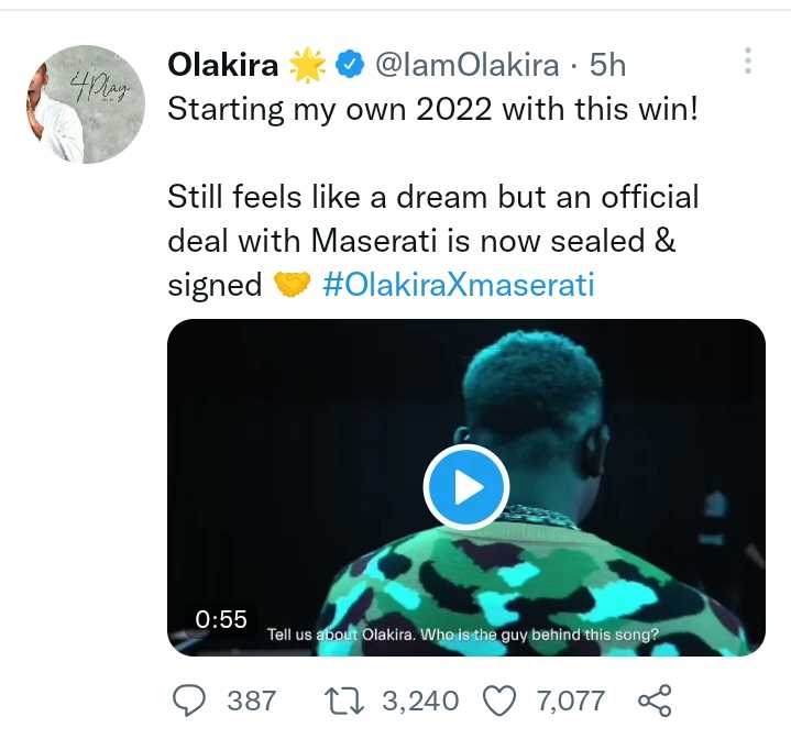 If 36 millions views seemed surreal, a real #Maserati collaboration seemed unreal for @IamOlakira. pic.twitter.com/rnB71MKFJl