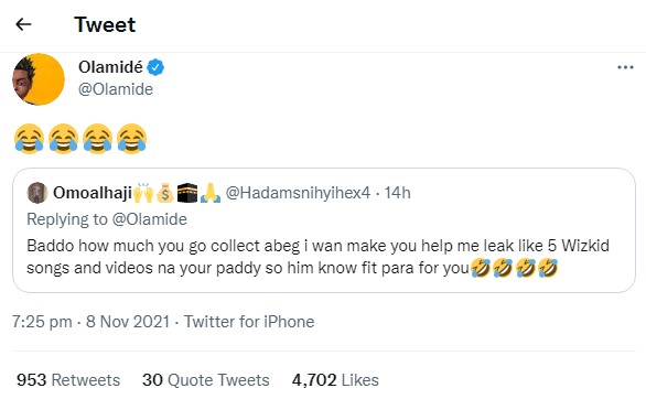A social media user had asked Olamide to state the amount he would accept, so that he can release five of Wizkid’s songs.
