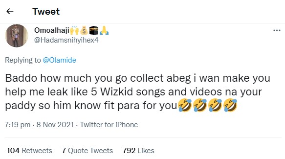 “Baddo how much you go collect abeg i wan make you help me leak like 5 Wizkid songs and videos na your paddy so him know fit para for you”, he wrote.