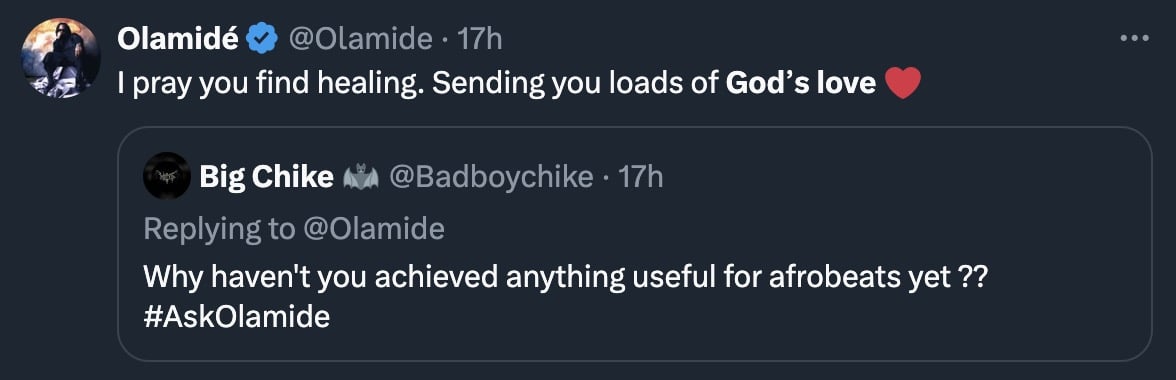 Contrary to the expectation of a hot clapback from Olamide, the singer simply prayed for the troll, wishing him divine healing from his wound.