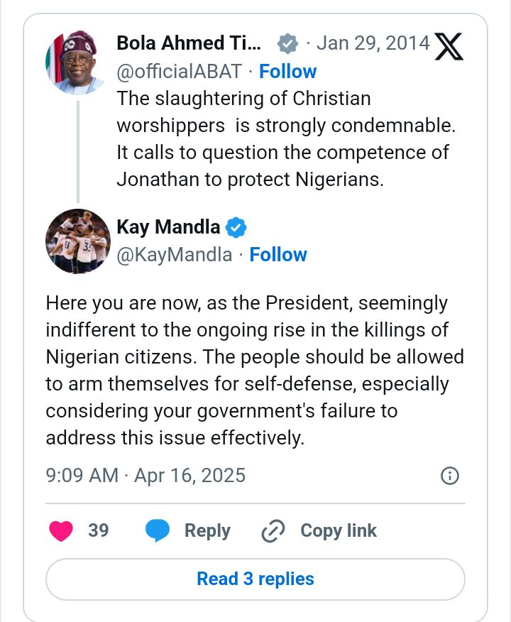 @KayMandla said; “Here you are now, as the President, seemingly indifferent to the ongoing rise in the killings of Nigerian citizens. The people should be allowed to arm themselves for self-defense, especially considering your governments failure to address this issue effectively.”