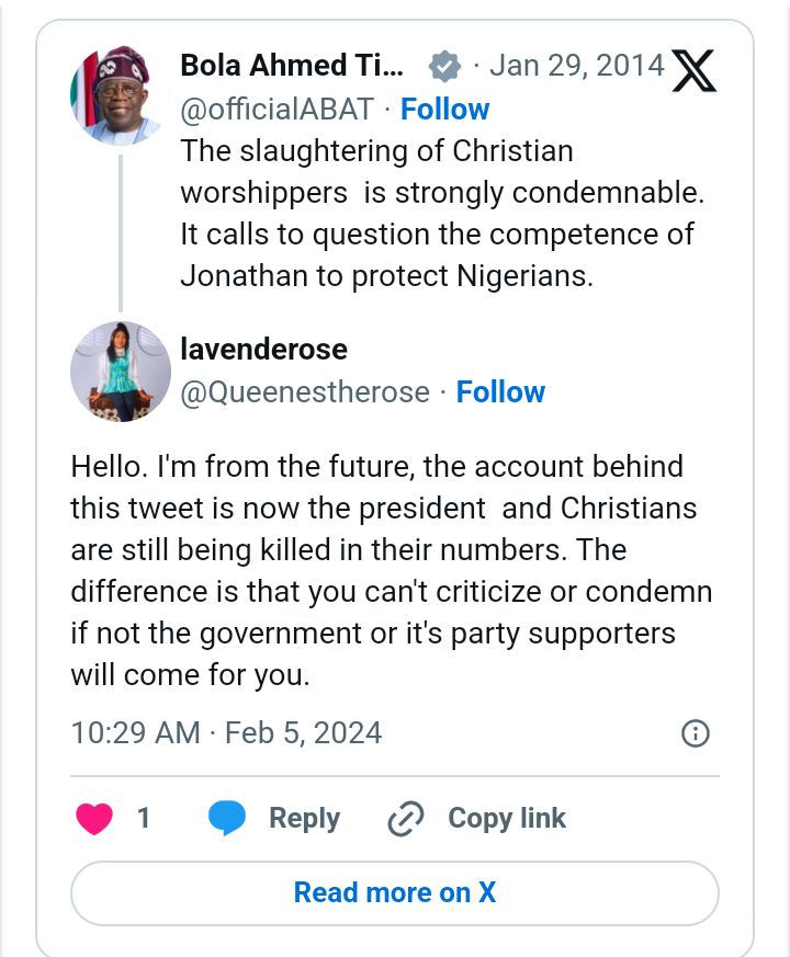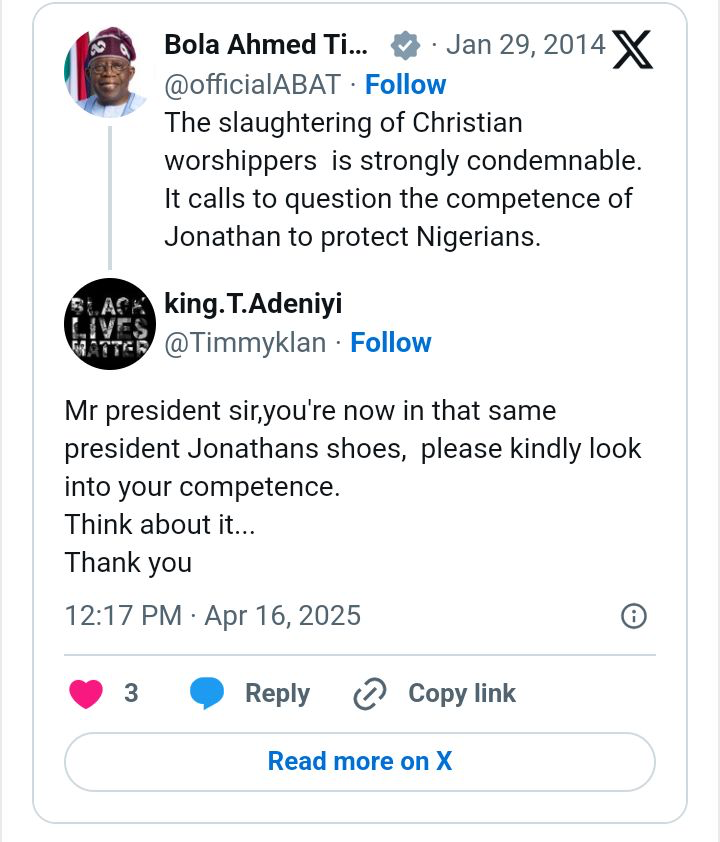 Old tweet of Tinubu condemning Jonathan over inability to tackle insecurity trends amid Plateau, Benue killings
