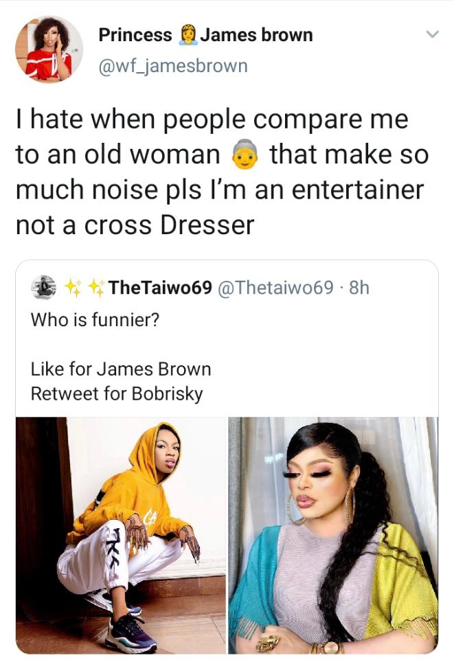 Nigerian crossdresser, James Brown has thrown shades at Bobrisky, while addressing those comparing him to Bob.