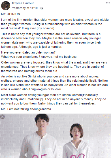 Favour took to his social media page via Facebook to air his opinion about older and younger women as regards love relationship.