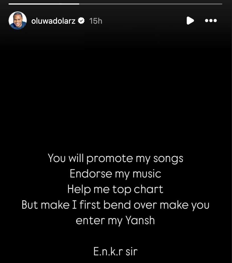 Oluwadolarz claimed the executive offered to help his music career—promoting his songs and boosting chart performance—but only if he agreed to a sexual favour.