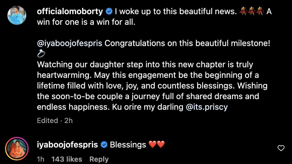 “I woke up to this beautiful news. 💃💃💃 A win for one is a win for all. @iyaboojofespris Congratulations on this beautiful milestone! 💍