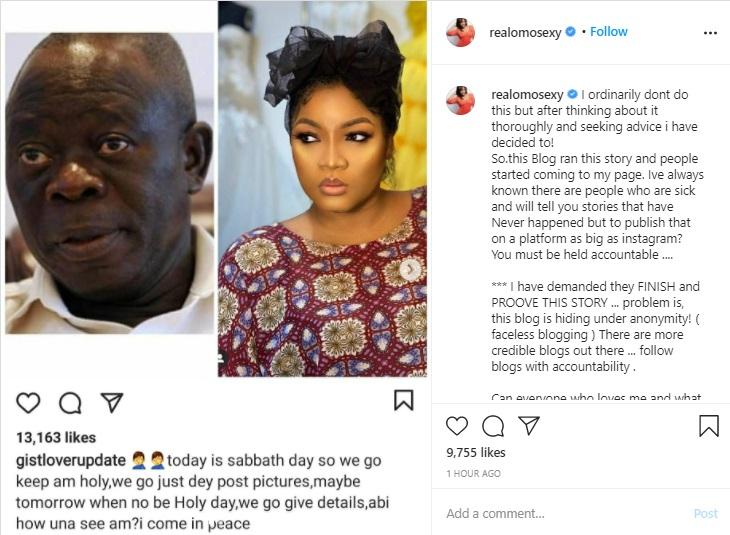 Controversial Instagram blogger, Gist Lover Blog alleged in a post that the actress is having an affair with Oshiomole.