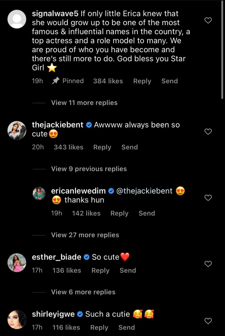 “If only little Erica knew that she would grow up to be one of the most famous & influential names in the country, a top actress and a role model to many. We are proud of who you have become and there’s still more to do. God bless you Star Girl,” a fan wrote.