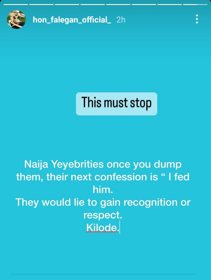 Popular politician, Opeyemi David Falegan has thrown a shade at veteran actress, Tonto Dikeh after she claimed she fed her ex-husband, Churchill Olakunle.