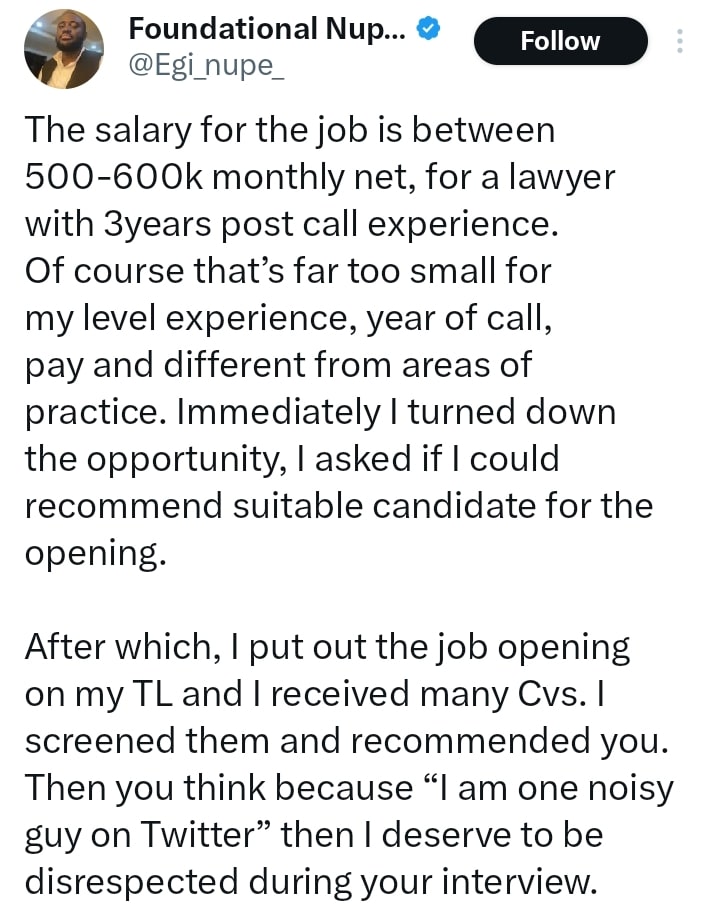 “One noisy guy on Twitter” – Lawyer shares how lady he recommended for job lost it after insulting him during interview