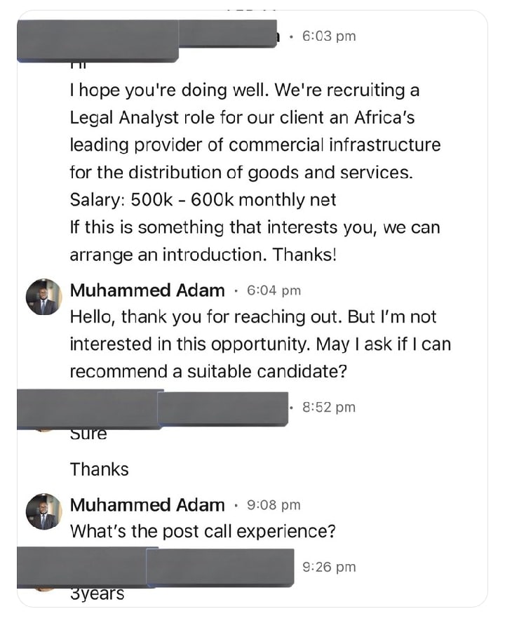 A lawyer who recommended a lady for a N500-600K salary job has shared how she lost it after she described him as a noisy guy during her interview.