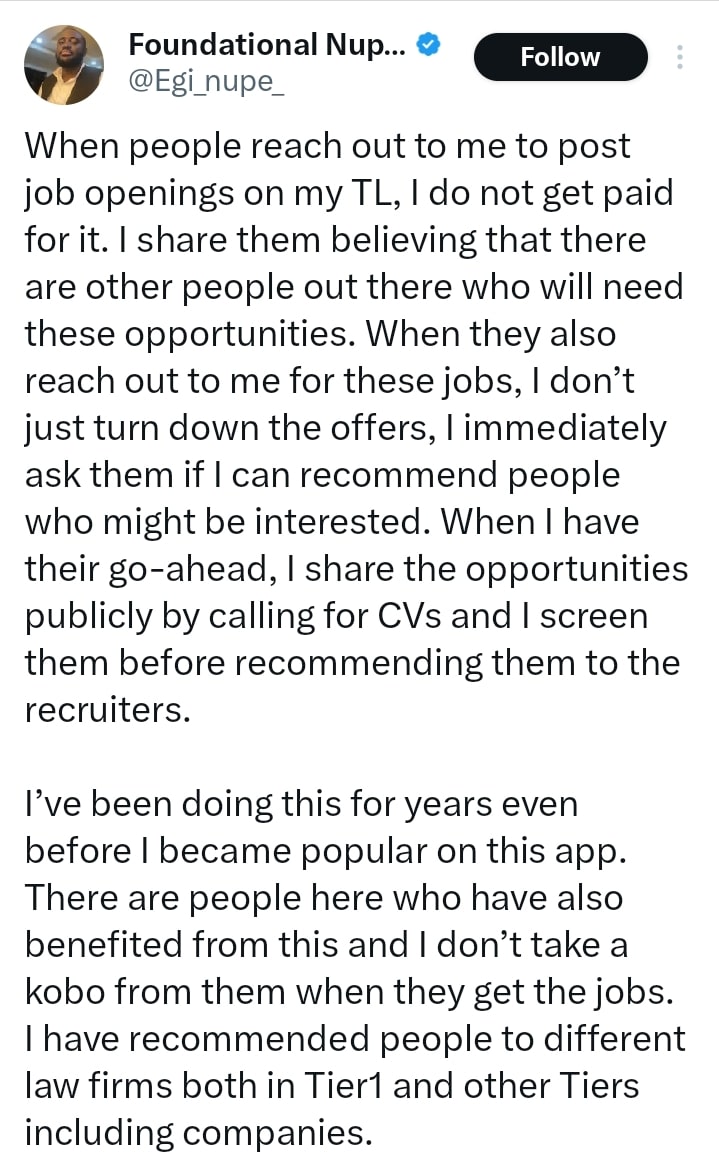 “I recommended someone for a job and on the day of the interview, they asked her how she got to know about the job and she said: through one noisy guy on Twitter.