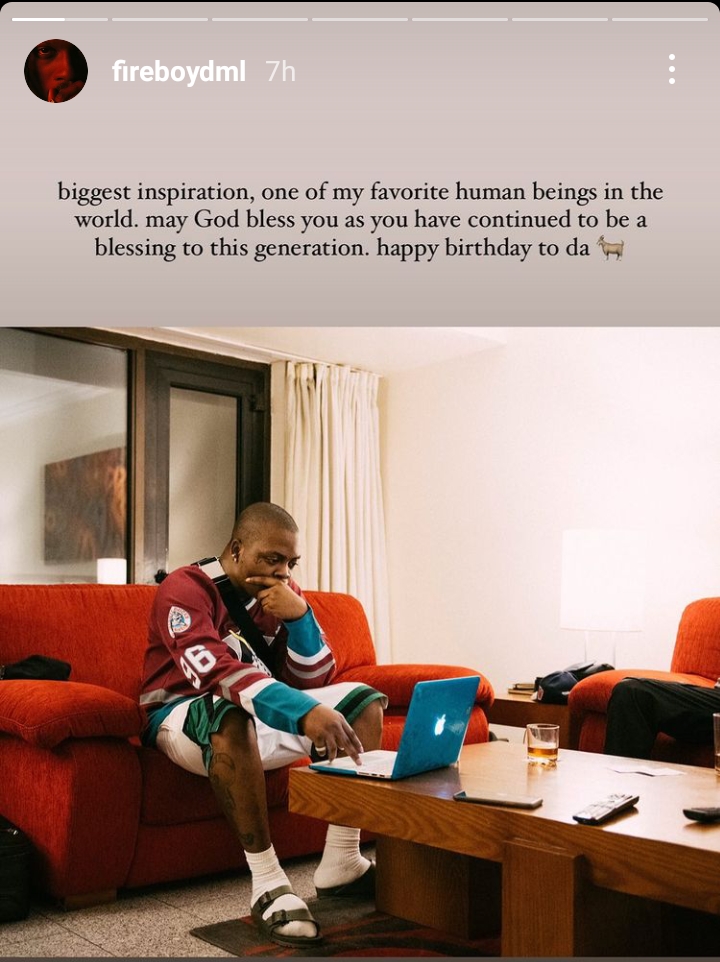 The sensational singer, on his Instagram story, described the award-winning rapper as his biggest inspiration as he wished him a happy birthday.