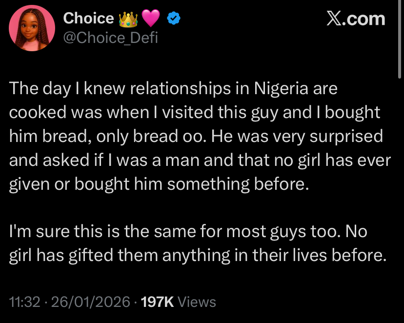 The lady, identified on X (formerly Twitter) as @Choice_Defi, recounted how she visited a man she knew and decided to give him a small gift, just bread.