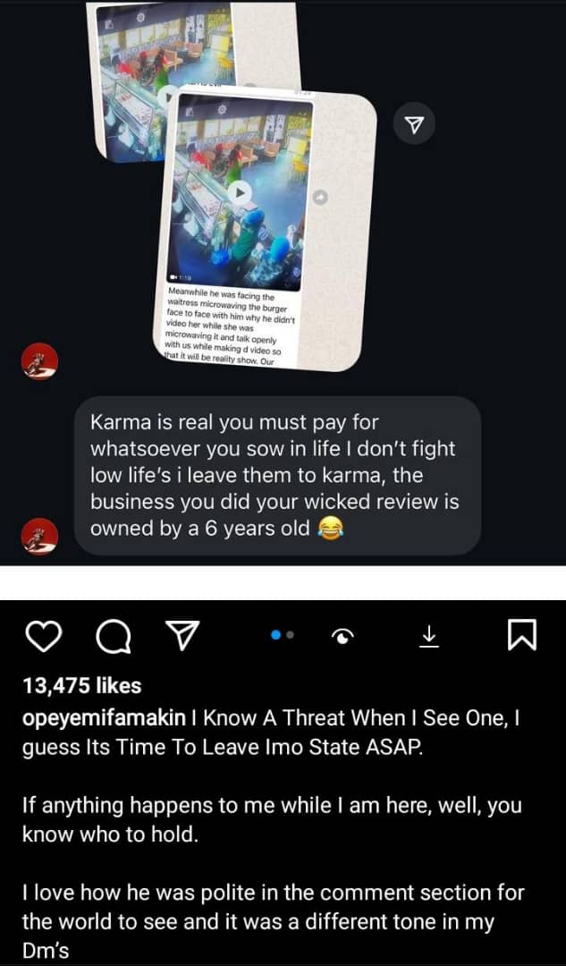 The food critic wrote: “I Know A Threat When I See One, I guess Its Time To Leave Imo State ASAP. If anything happens to me while I am here, well, you know who to hold. I love how he was polite in the comment section for the world to see and it was a different tone in my Dm’s”