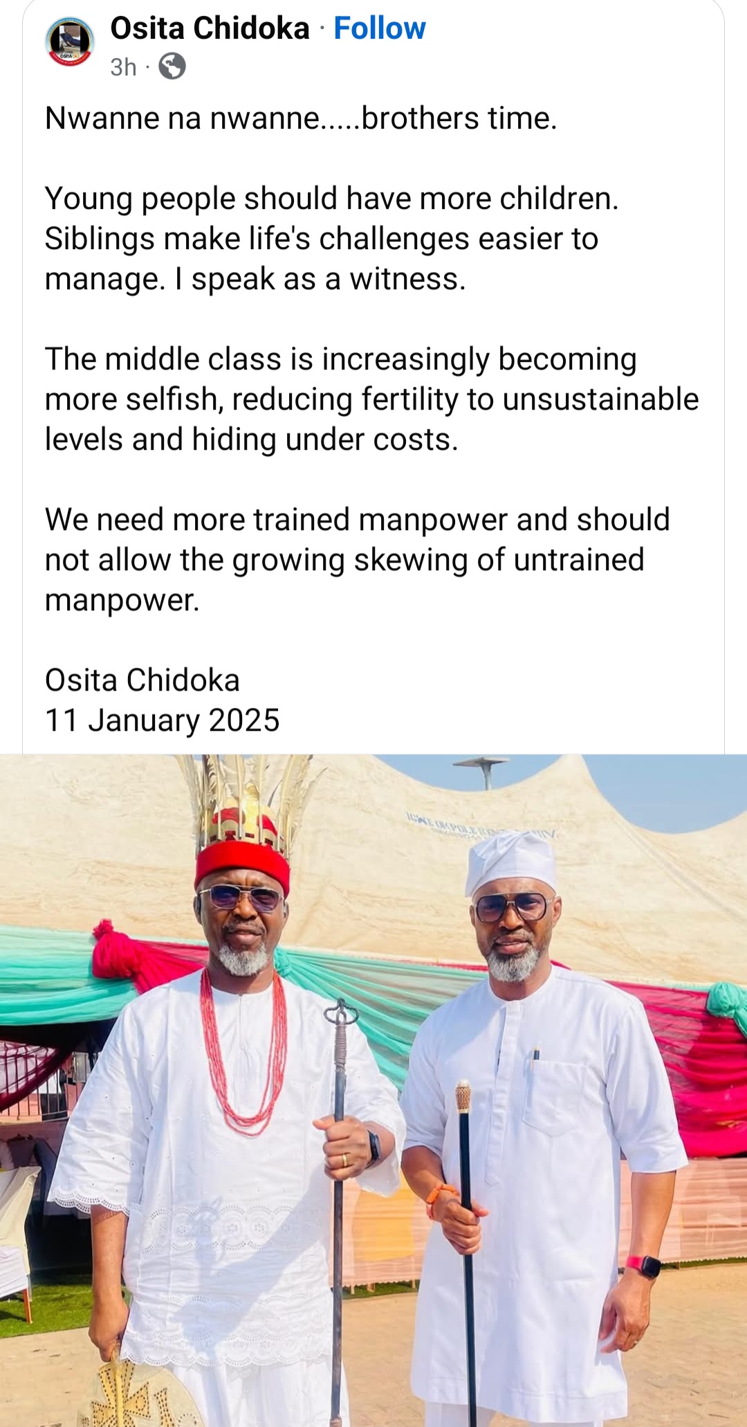 Osita Chidoka took to his Facebook page to share his opinion on why he thinks giving birth to a lot of children is necessary.