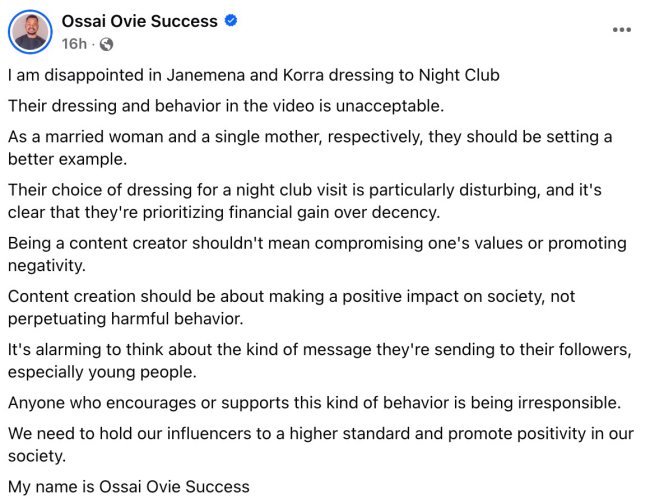 Ossai Ovie Success, the Senior Special Assistant on Media to the Delta State Governor, has expressed disappointment in controversial singer Korra Obidi and dancer Janemena for their choice of outfits for a nightclub outing.