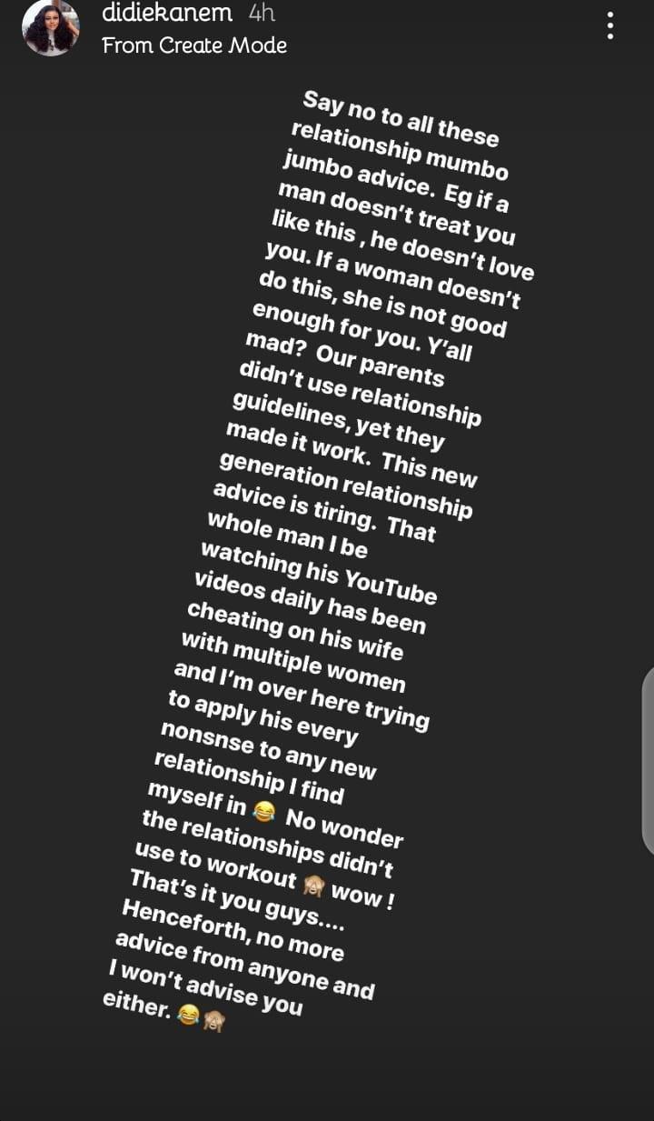 She took to her Instagram stories to rant on how her relationships failed after constantly implementing the “do’s” and “don’t” into her relationships.