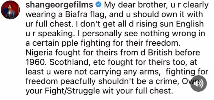 “My dear brother, u r clearly wearing a Biafra flag, and u should own it with ur full chest. I don’t get all d rising sun English u r speaking. I personally see nothing wrong in a certain pple fighting for their freedom. Nigeria fought for theirs from d British before 1960. Scotland, etc fought for theirs too, at least u were not carrying any arms, fighting for freedom peacefully shouldn’t be a crime, Own your Fight/Struggle wit your full chest.”