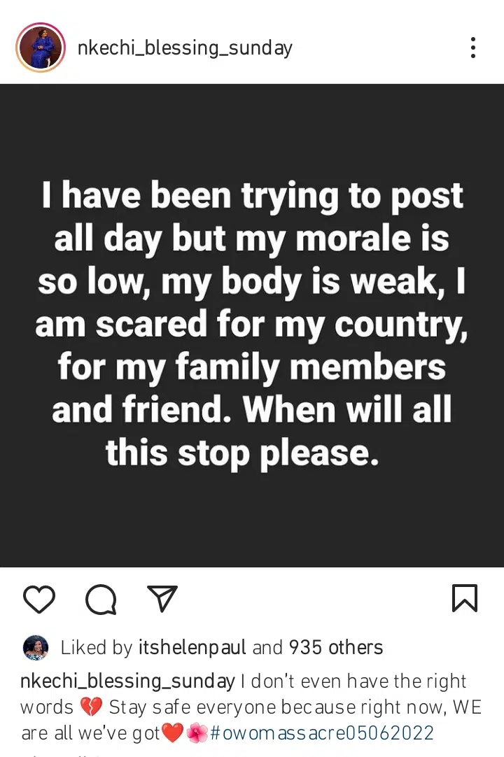 Popular Nollywood actress, Nkechi Blessing, expresses utmost heartbreak amidst the massacre that took the lives of many in Ondo State.