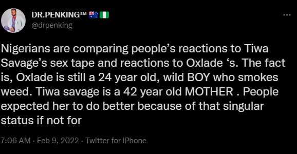 “Nigerians are comparing people’s reactions to Tiwa Savage’s s@x tape and reactions to Oxlade ‘s. The fact is, Oxlade is still a 24 year old, wild BOY who smokes weed. Tiwa savage is a 42 year old MOTHER . People expected her to do better because of that singular status if not for anything for the mental health of her son in the next few years.