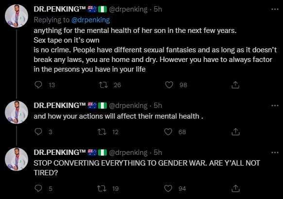 Twitter user identified by his handle as @drpenking weighs in on the current tape saga as he explains why Oxlade’s videos aren’t getting backlashes as compared to Tiwa Savage’s own.