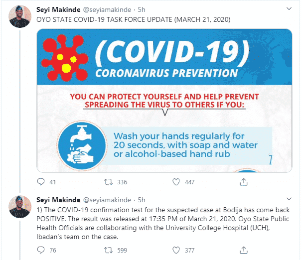 “The COVID-19 confirmation test for the suspected case at Bodija has come back POSITIVE. The result was released at 17:35 PM of March 21, 2020,” he said.