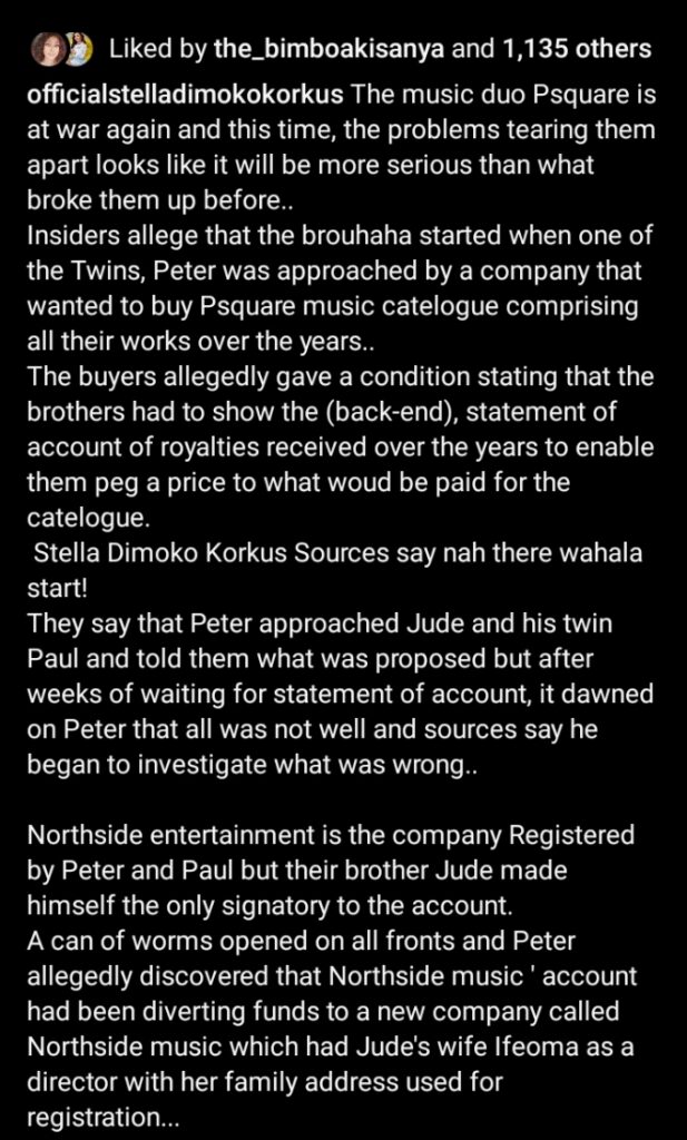 “Stella Dimoko Korkus Sources say nah there wahala start! They say that Peter approached Jude and his twin Paul and told them what was proposed but after weeks of waiting for a statement of account, it dawned on Peter that all was not well and sources say he began to investigate what was wrong..