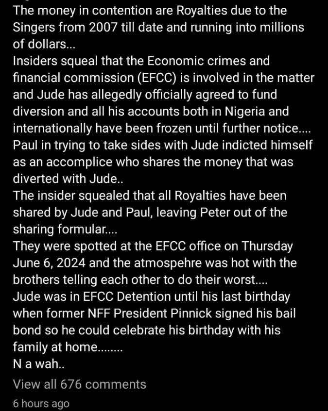 “The insider squealed that all Royalties have been shared by Jude and Paul, leaving Peter out of the sharing formula….