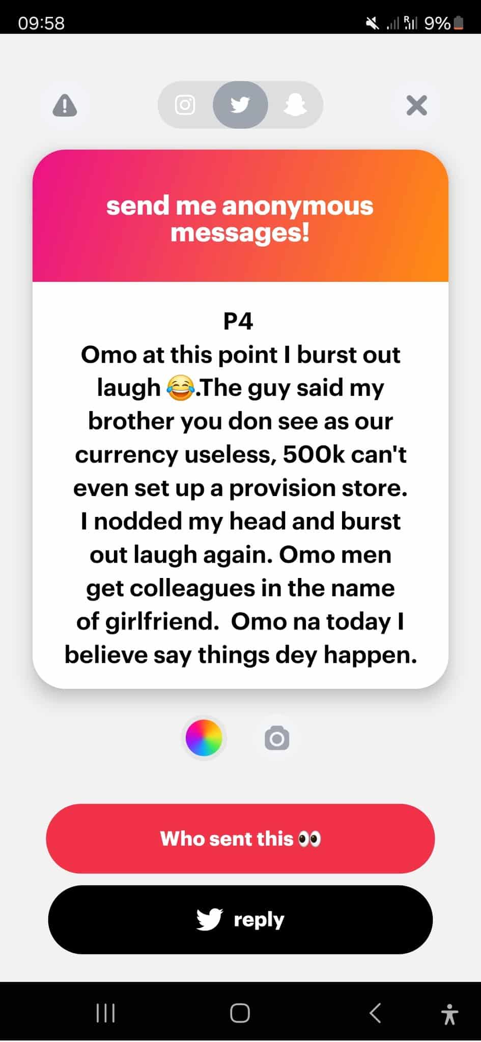 @Ablejoe080: “This last guy could have used the 500k to help her little sister to establish her cake business and she will stop begging guys for urgent 2k but here he’s misbehaving attempting to please poorly raised girl whose only contribution is nyash and brezz.”