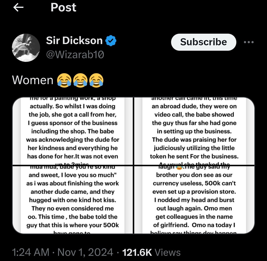 The painter burst into laughter, saying, “The guy just sighed, saying, ‘Our currency is useless; 500,000 can’t even set up a small shop.’ I just laughed along. Men really have ‘colleagues’ in the name of girlfriends. Today, I truly believe strange things happen.”