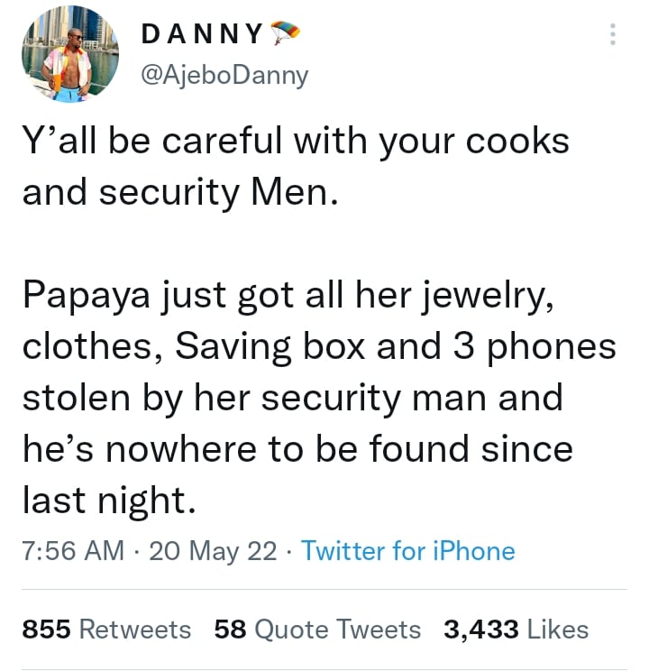 Papaya just got all her jewelry, clothes, Saving box and 3 phones stolen by her security man and he’s nowhere to be found since last night.”