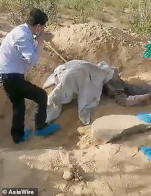 Disturbing footage shows Ms Wang covered in mud while being pulled out from the burial pit by two police officers.