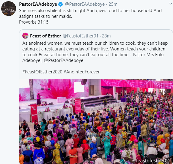 As anointed women, we must teach our children to cook, they can’t keep eating at a restaurant everyday of their live. Women teach your children to cook & eat at home, they can’t eat out all the time – Pastor Mrs Folu Adeboye