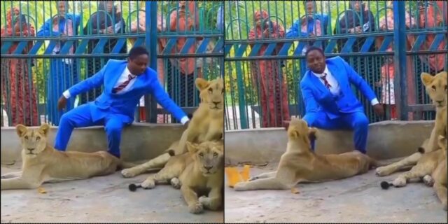 The said preacher teased all three lions in their den while seated comfortably, proving to his church members that God’s power is real.