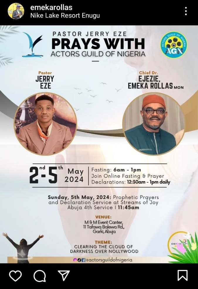 The national president of the guild, Emeka Rollas, announced this initiative on Instagram on Monday, emphasizing Pastor Jerry Eze, the founder of Streams of Joy International Church, will be leading the prayers.