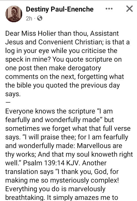 In the Facebook post centered around beauty, Pastor Eneche’s daughter stated that this ‘Miss Holier than thou, Assistant Jesus and Convenient Christian’ quote scripture on one post and then makes derogatory comments on the next, forgetting what the bible quoted the previous day says.