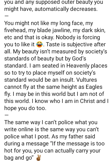 “You might not like my long face, my fivehead, my blade jawline, my dark skin, etc and that is okay. Nobody is forcing you to like it. Taste is subjective after all. My beauty isn’t measured by society’s standards of beauty but by God’s standard. I am seated in Heavenly places so to try to place myself on society’s standard would be an insult. Vultures cannot fly at the same height as Eagles fly. I may be in this world but I am not of this world. I know who I am in Christ and I hope you do too.