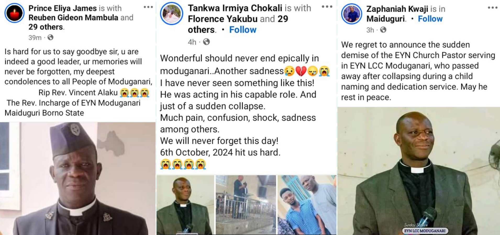 “We regret to announce the sudden demise of the EYN Church Pastor serving in EYN LCC Moduganari, who passed away after collapsing during a child naming and dedication service. May he rest in peace,” one Zaphaniah Kwaji wrote.